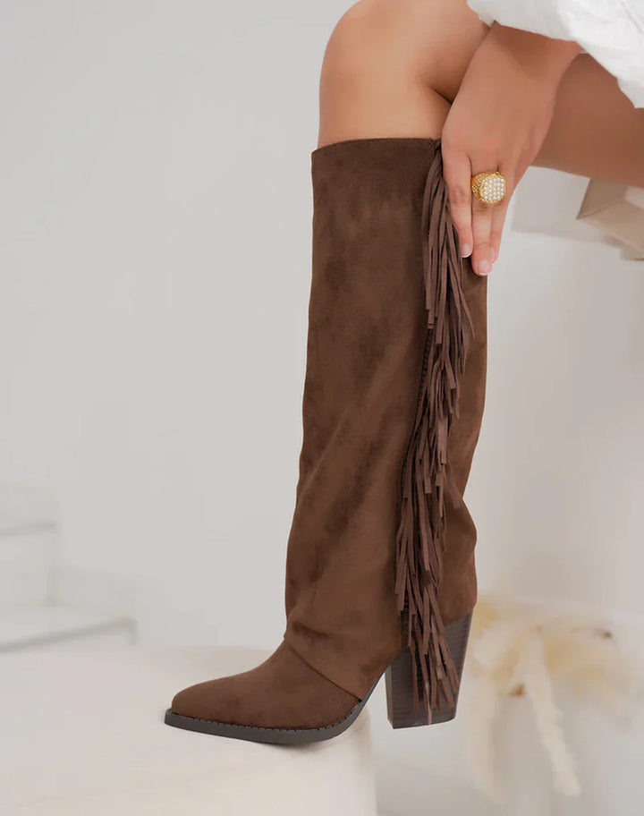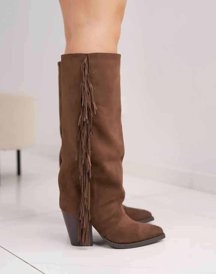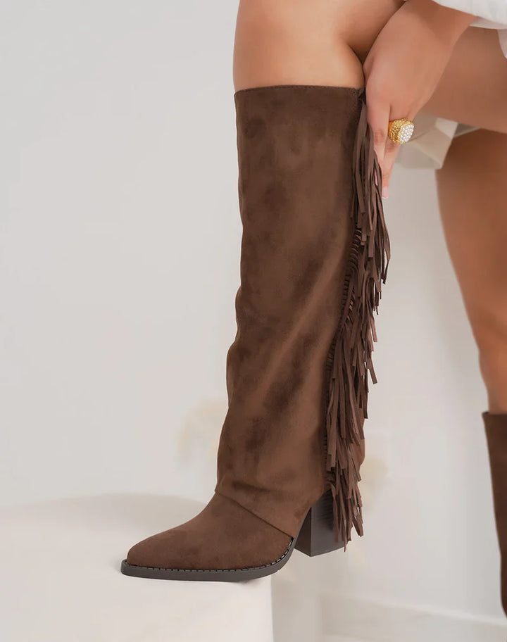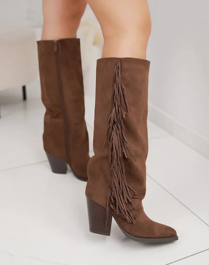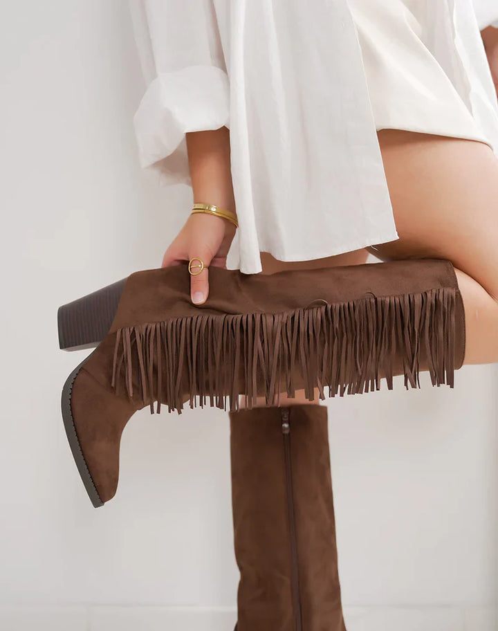 Pour une touche western stylée, optez pour les Bottes en Suédine Fringle. Ces bottes accrocheuses sont fabriquées en suédine douce et ornées de franges ludiques le long de la tige. Le solide talon bloc apporte à la fois de la longueur et du confort.