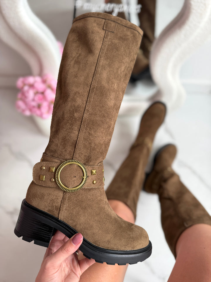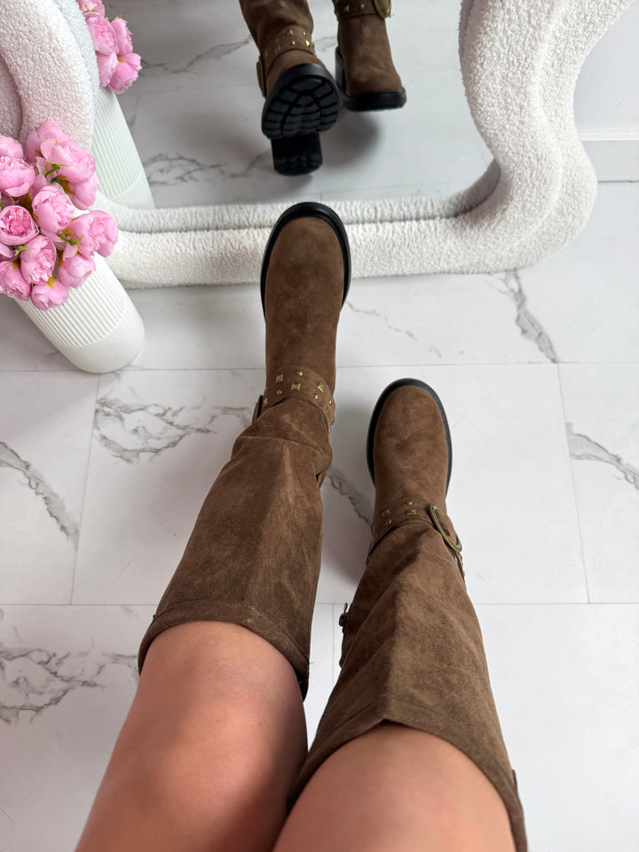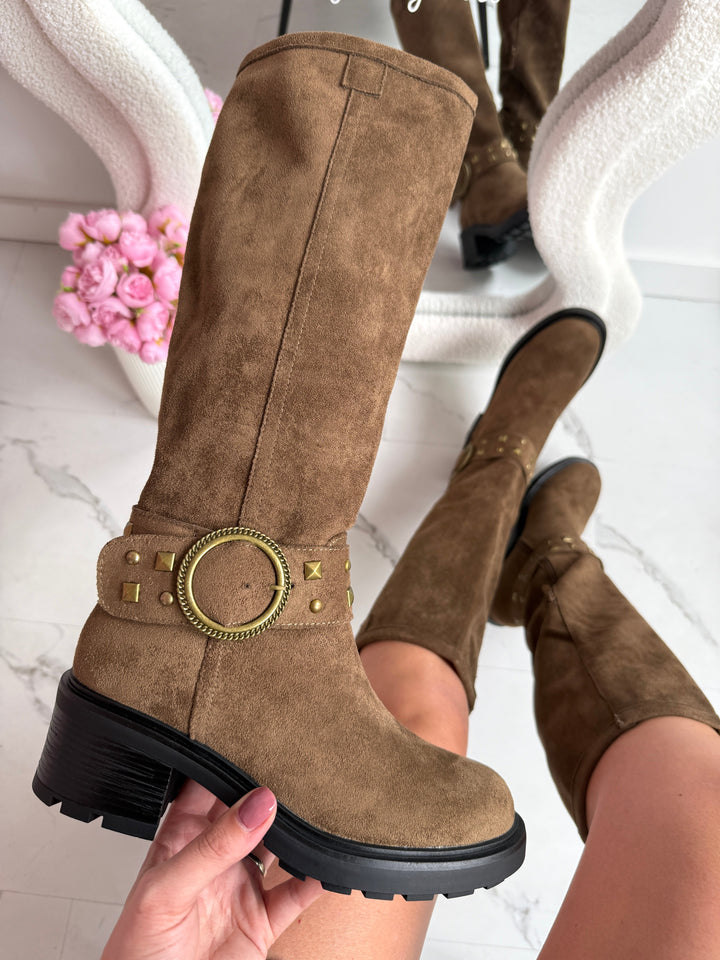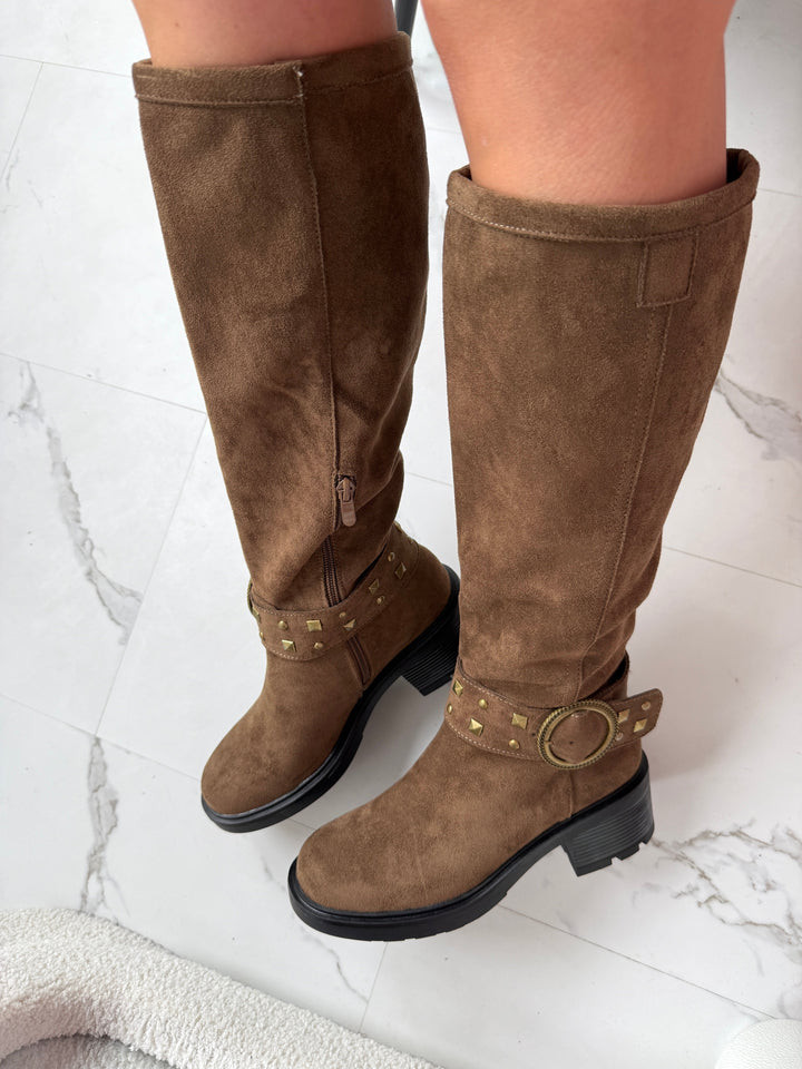 Besoin de bottes qui font sensation ? Découvrez les Bottes Hautes Tonia – un mélange parfait de robustesse et de féminité. Ces bottes hautes en suédine douce sont ornées d'une boucle frappante et de clous autour de la cheville pour une touche audacieuse. Grâce à leur talon solide, vous serez non seulement élégante, mais aussi confortable. Disponibles en noir intemporel ou en taupe chaud : quelle couleur correspond à votre humeur ?