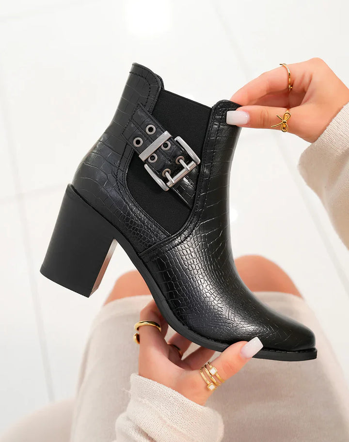 Les Bottes Marianne sont le mélange parfait d'audace et d'élégance. Avec leur fermeture à boucle robuste, leur look croco saisissant et leur talon bloc solide, ces bottines donnent à chaque tenue une touche de caractère et de style. Associez-les avec un jean, une jupe ou une robe pour un instantané de mode.