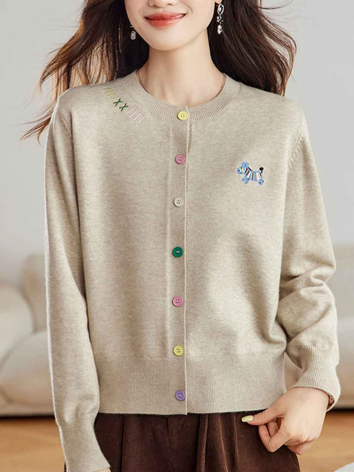 Cardigan Tricoté à Col Rond Lâche Camila avec Boutons Colorés Brodés