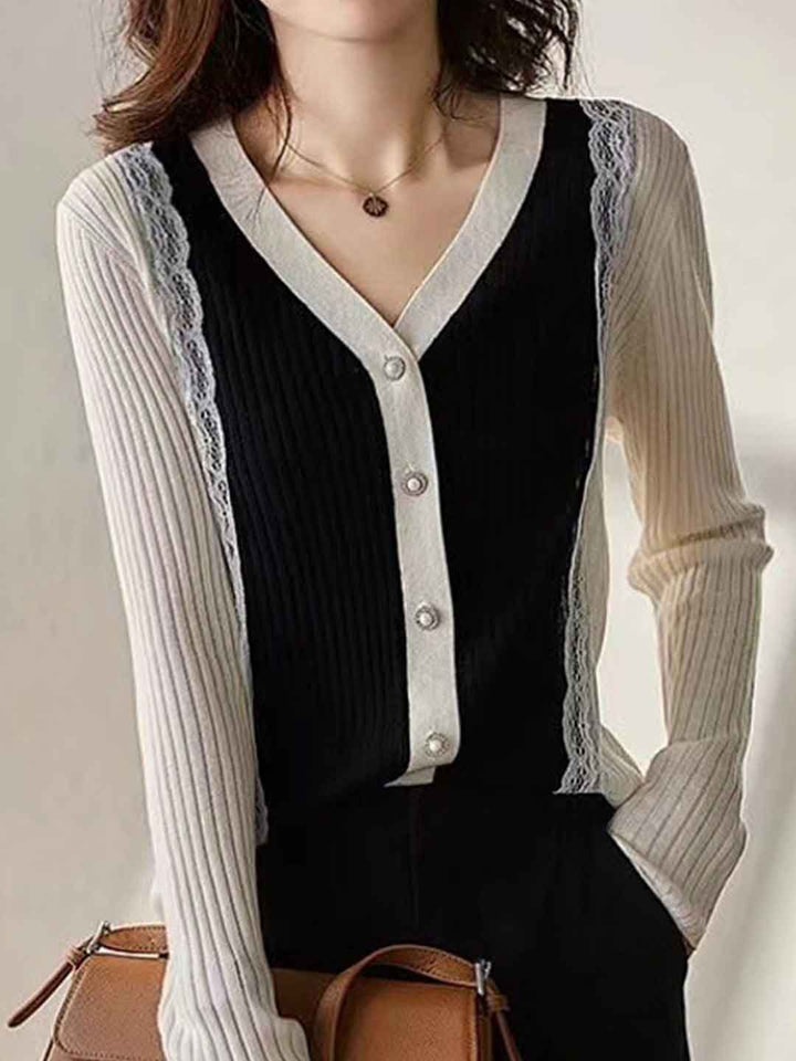 Cardigan Tricoté Slim V-Neck en Dentelle Charlotte