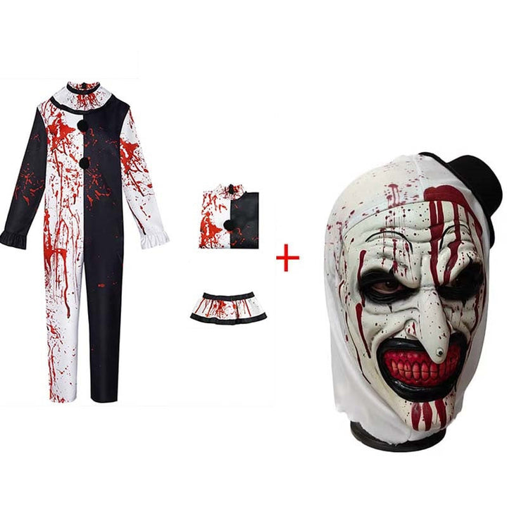 Conviértete en el payaso más aterrador de la gran pantalla con este disfraz completo inspirado en Terrifier. Incluye traje ensangrentado y máscara de látex, logrando un realismo perturbador perfecto para fiestas de Halloween, cosplay o eventos de terror. Disponible en versión masculina y femenina, confeccionado en algodón y poliéster para mayor comodidad, con acabados que potencian su impacto visual.