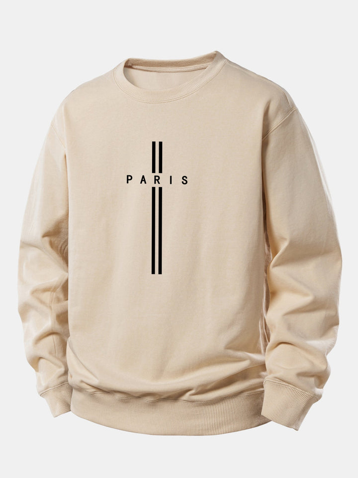 Bring Parisian-inspired flair to your casual look with the Paris stripe print relax fit sweatshirt. Designed with bold stripe graphics, a standout "Paris" print, and a laid-back fit, it blends effortless comfort with modern streetwear style.