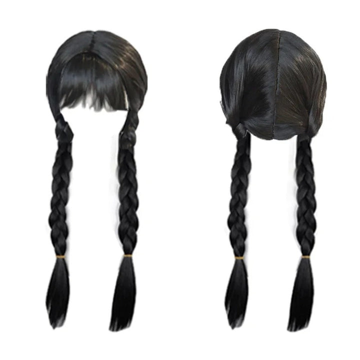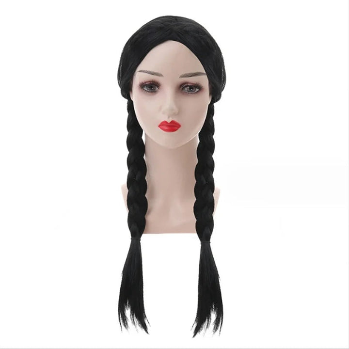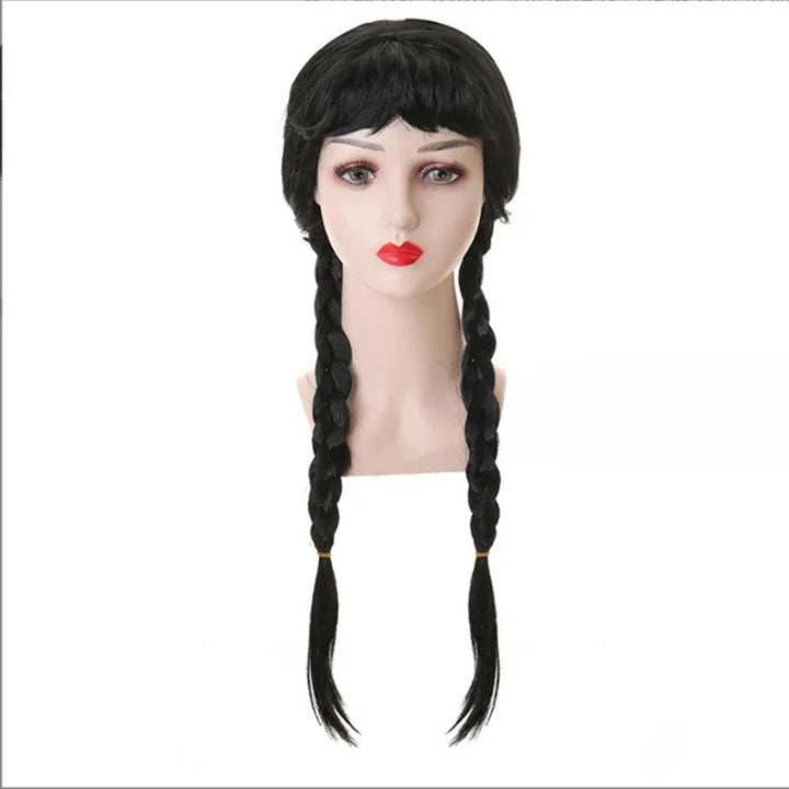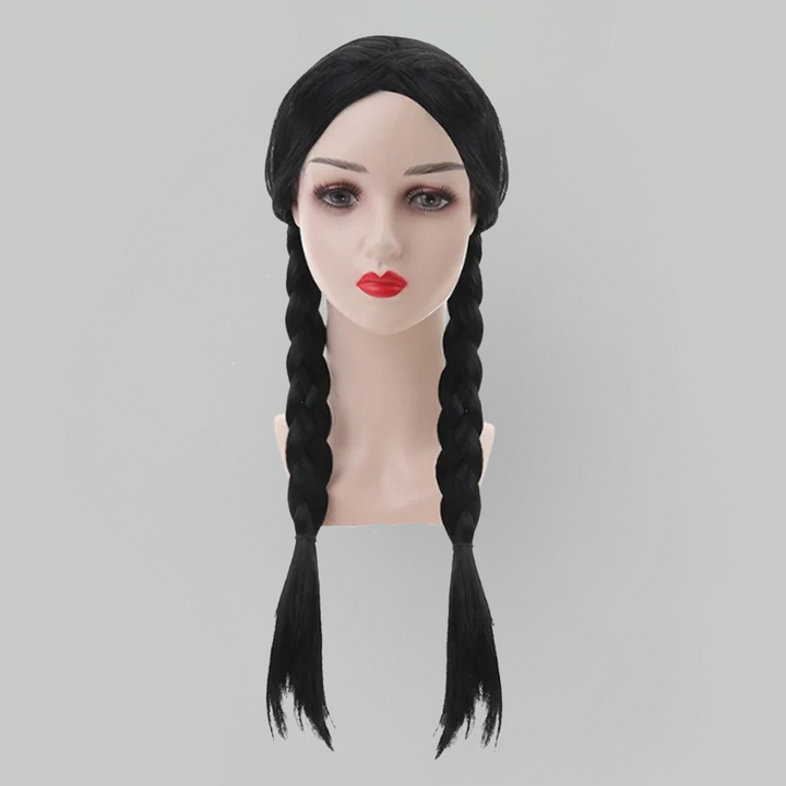 Transforma cualquier disfraz en un look auténtico con esta peluca de doble trenza negra con flequillo plano, inspirada en el icónico personaje de Miércoles. Suave, ligera y fácil de usar, es el complemento ideal para fiestas de Halloween, cosplay o juegos de rol.