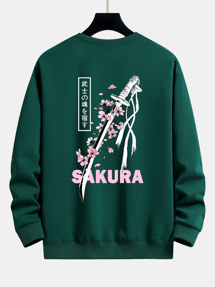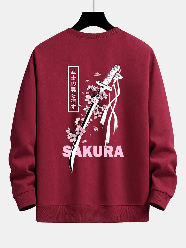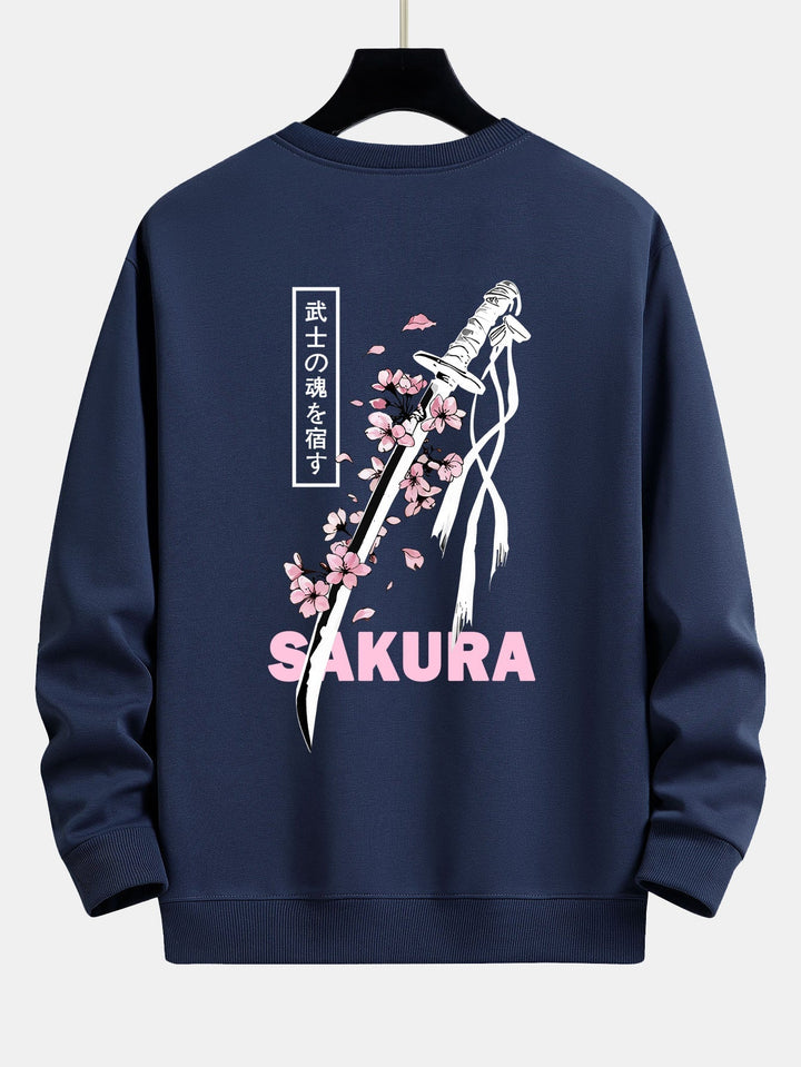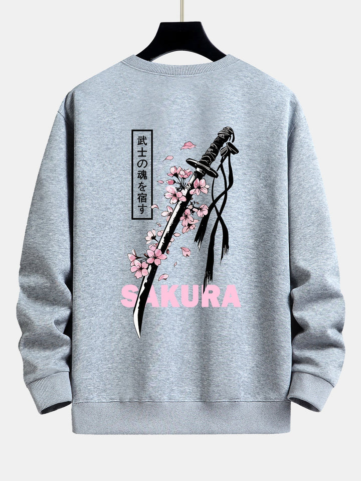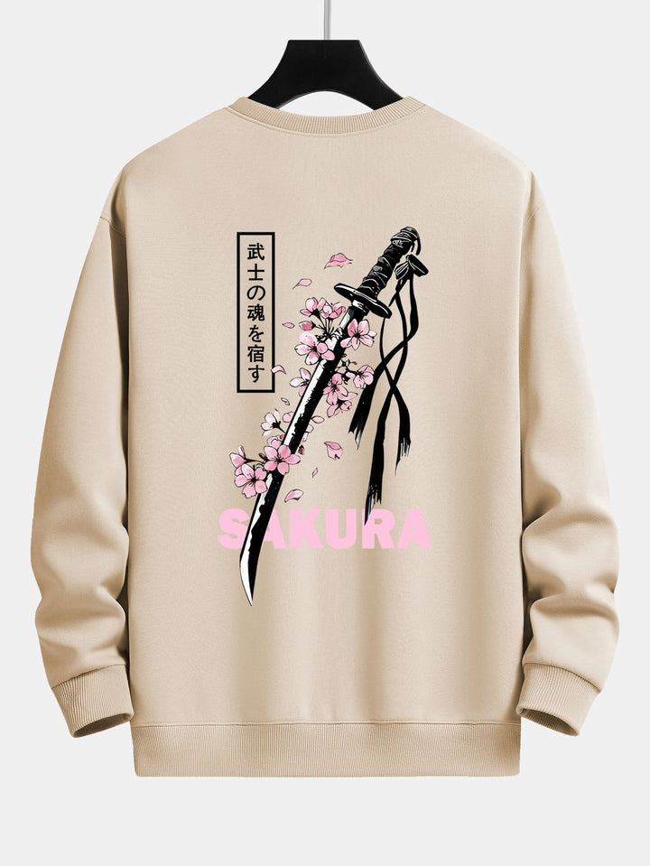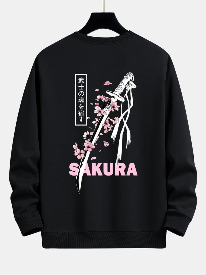 Design Unique : Ce sweatshirt arbore un katana entouré de fleurs de sakura, alliant l'art japonais à un style contemporain.