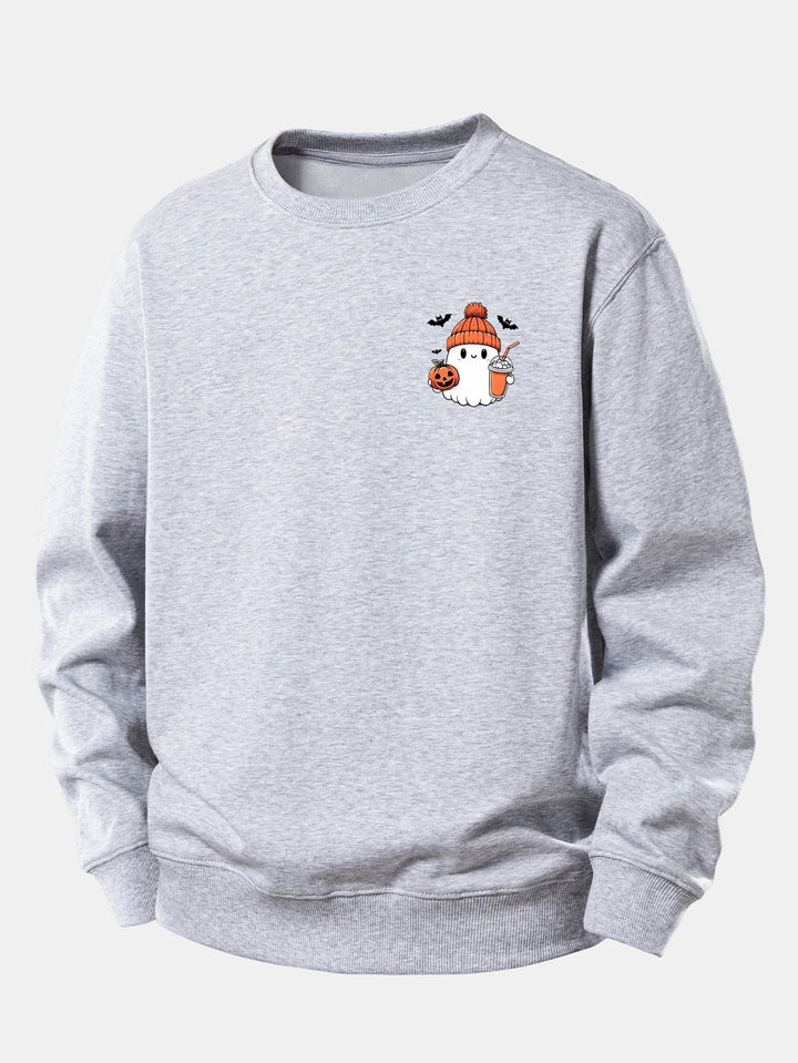 Confort et style pour Halloween: Restez à l'aise et festif avec notre adorable sweatshirt relax fit imprimé citrouille et fantôme. Ce modèle unique présente un fantôme mignon en bonnet tenant un latte à la citrouille épicée, accompagné d'une citrouille souriante, alliant parfaitement l'esprit spooky et la douceur.