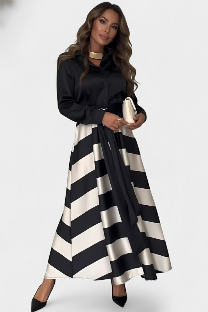 Gráfica, sofisticada y moderna, la bata Nessia reinventa la silueta camisera con un toque editorial. Les rayures audacieuses, la jupe ample et la ceinture surtidas en font une pièce frappante pour se démarquer avec élégance en toute ocasión.