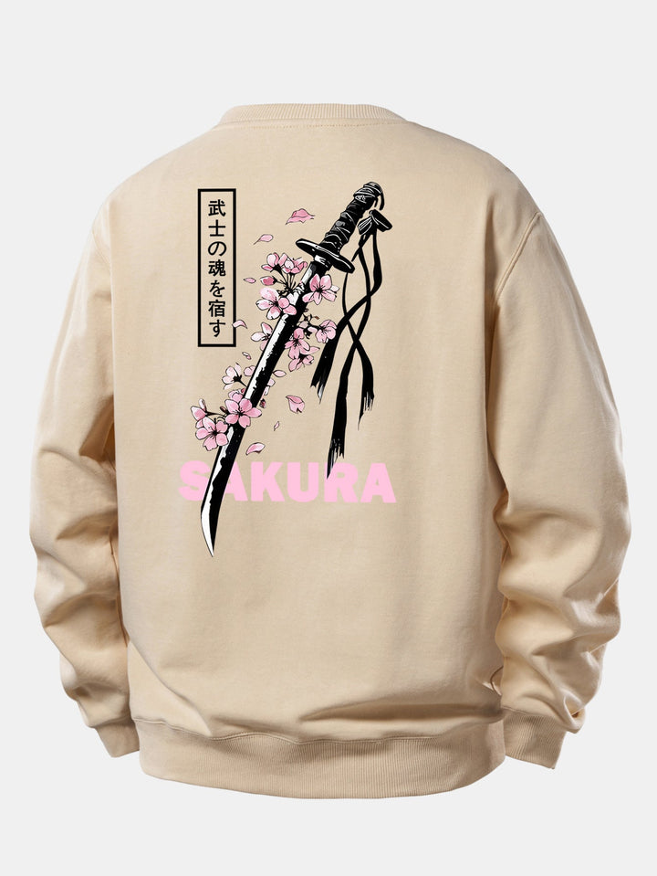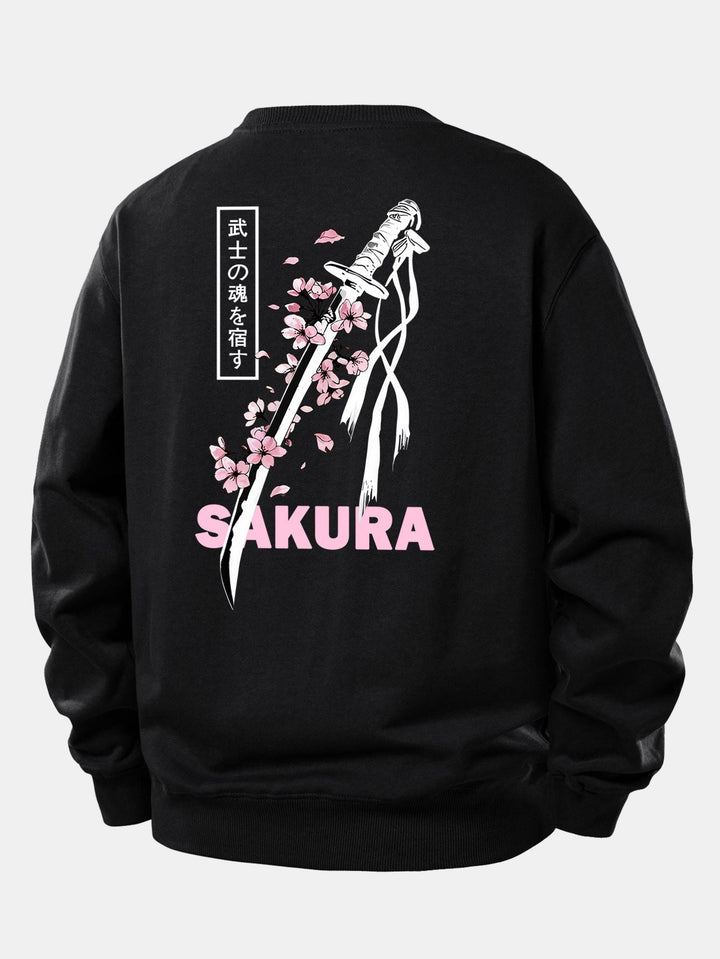 Featuring a striking design of a katana surrounded by delicate sakura blossoms, this sweatshirt combines Japanese-inspired artistry with everyday comfort. Its relaxed fit makes it perfect for layering or wearing solo, ideal for casual outings, streetwear looks, or cozy days at home.