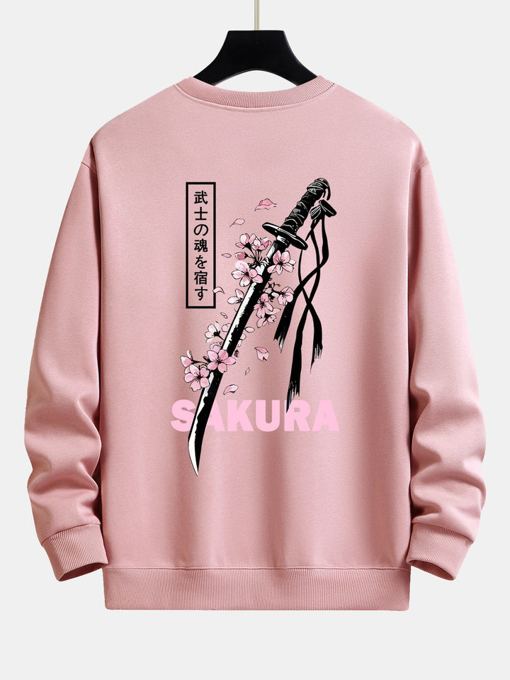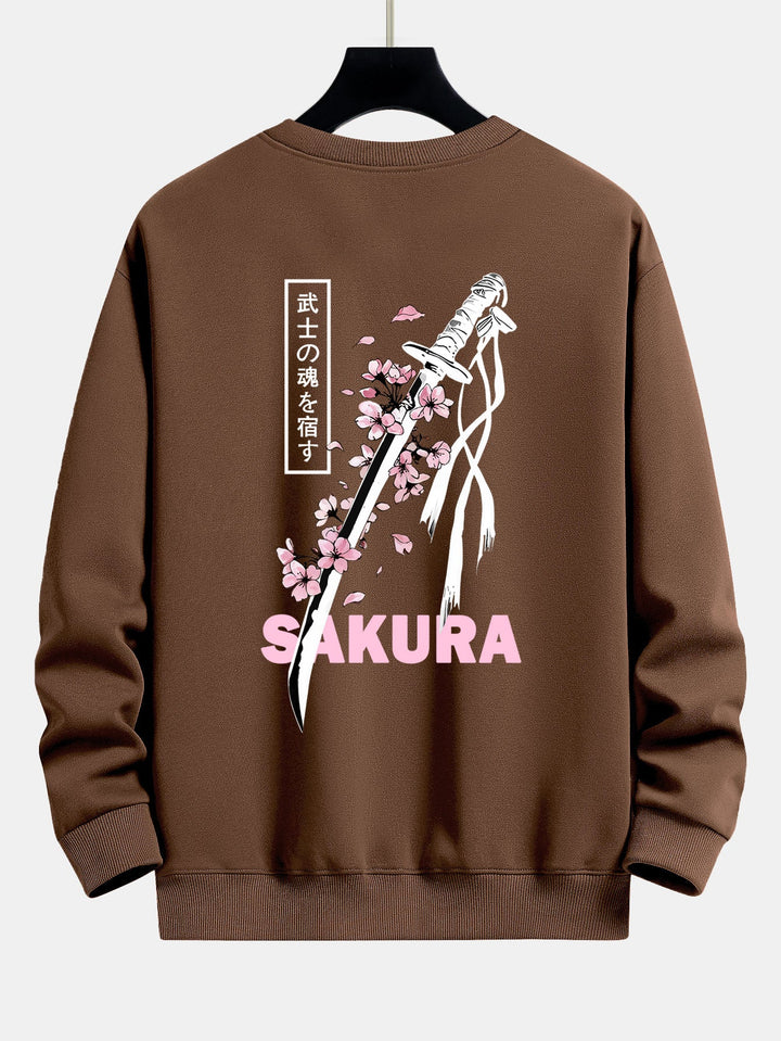 Featuring a striking design of a katana surrounded by delicate sakura blossoms, this sweatshirt combines Japanese-inspired artistry with everyday comfort. Its relaxed fit makes it perfect for layering or wearing solo, ideal for casual outings, streetwear looks, or cozy days at home.