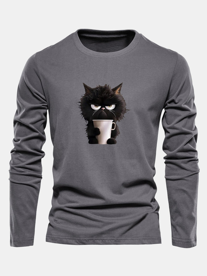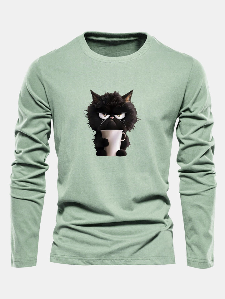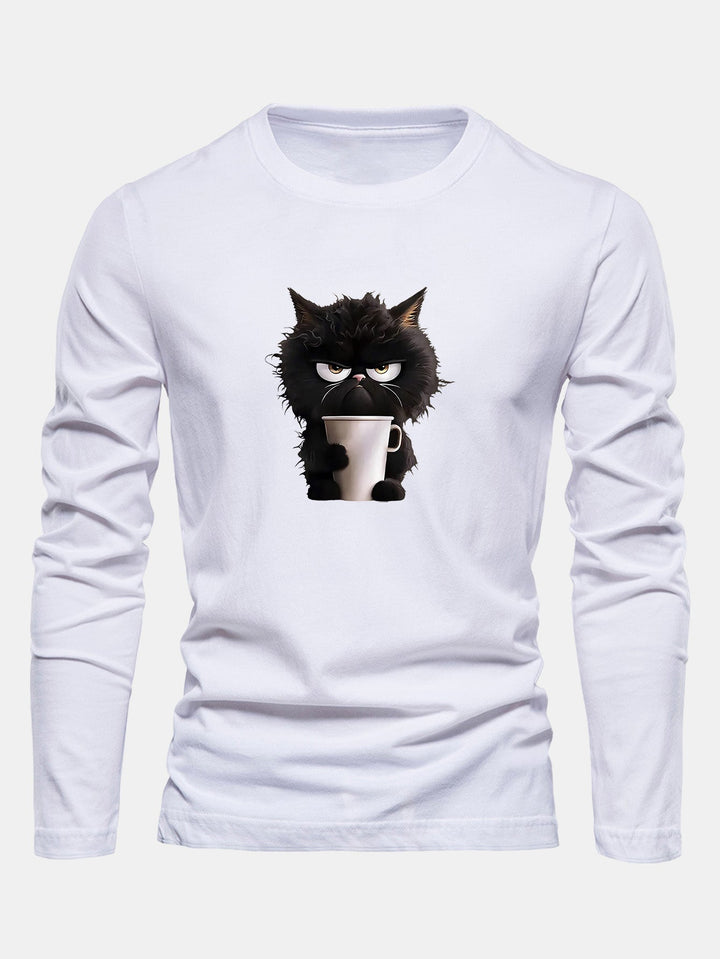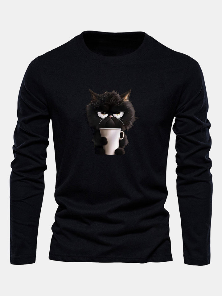T-shirt à manches longues en coton avec motif de chat noir dégustant un café