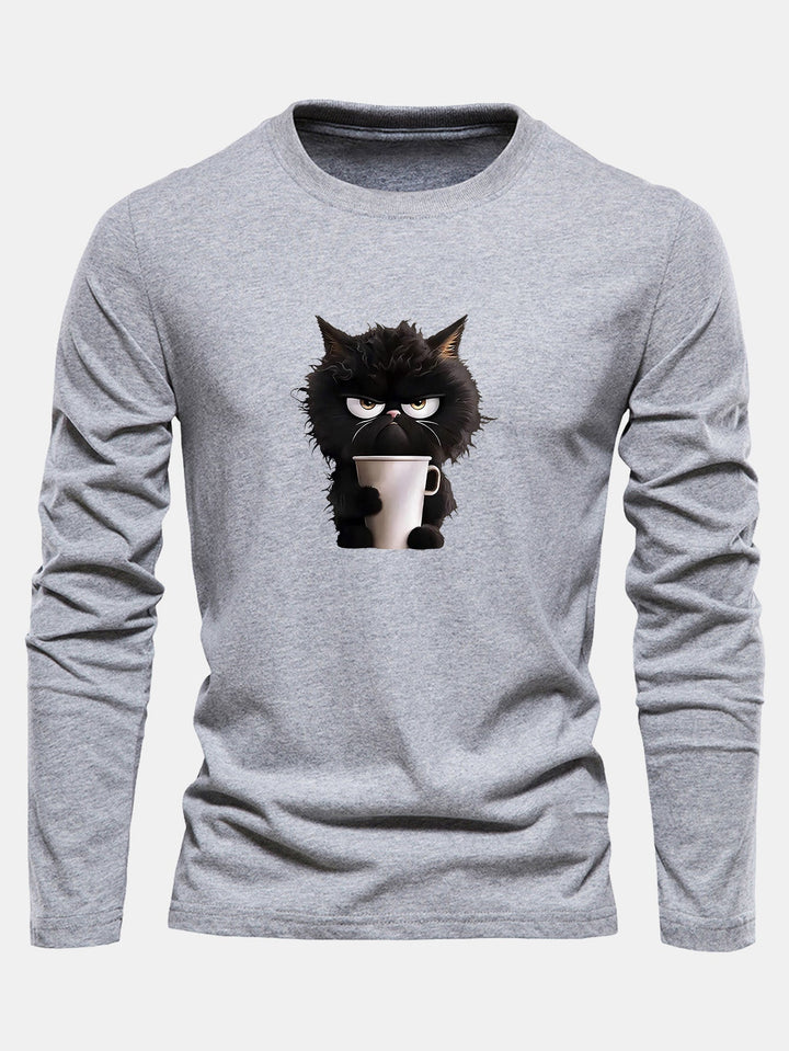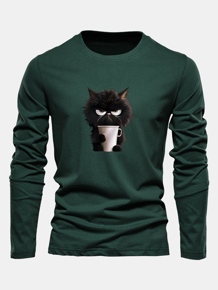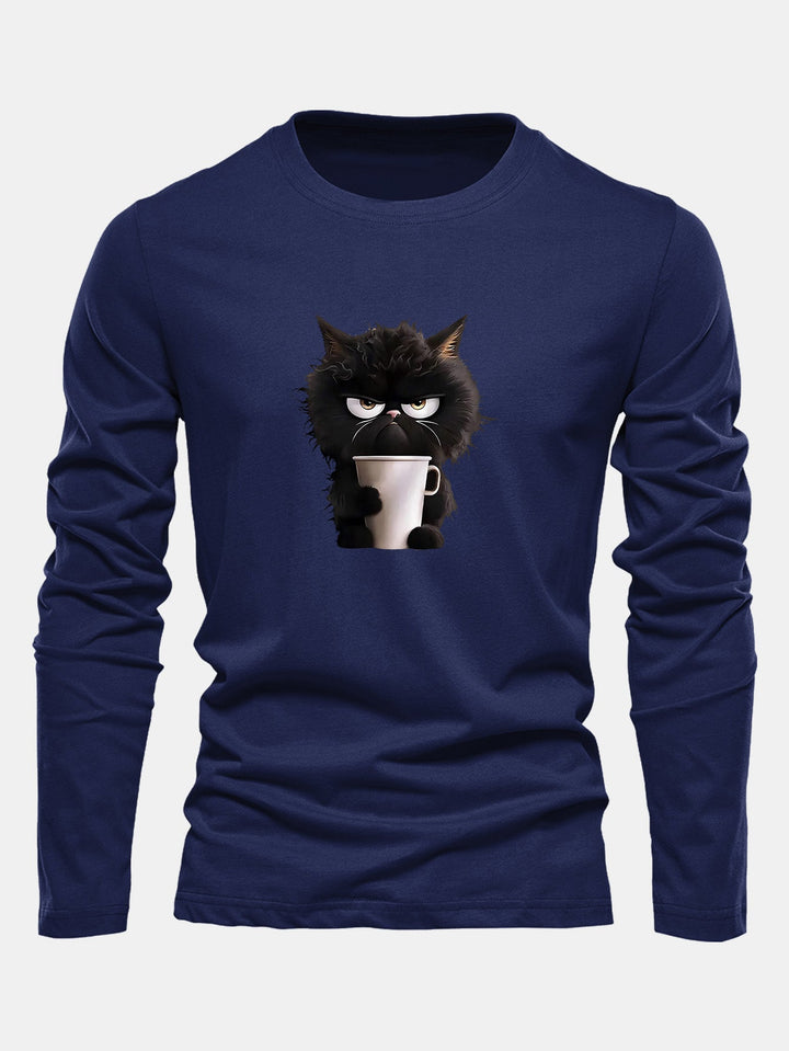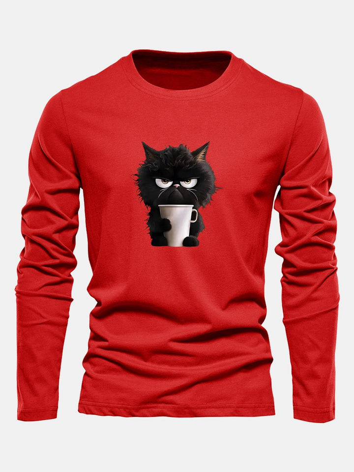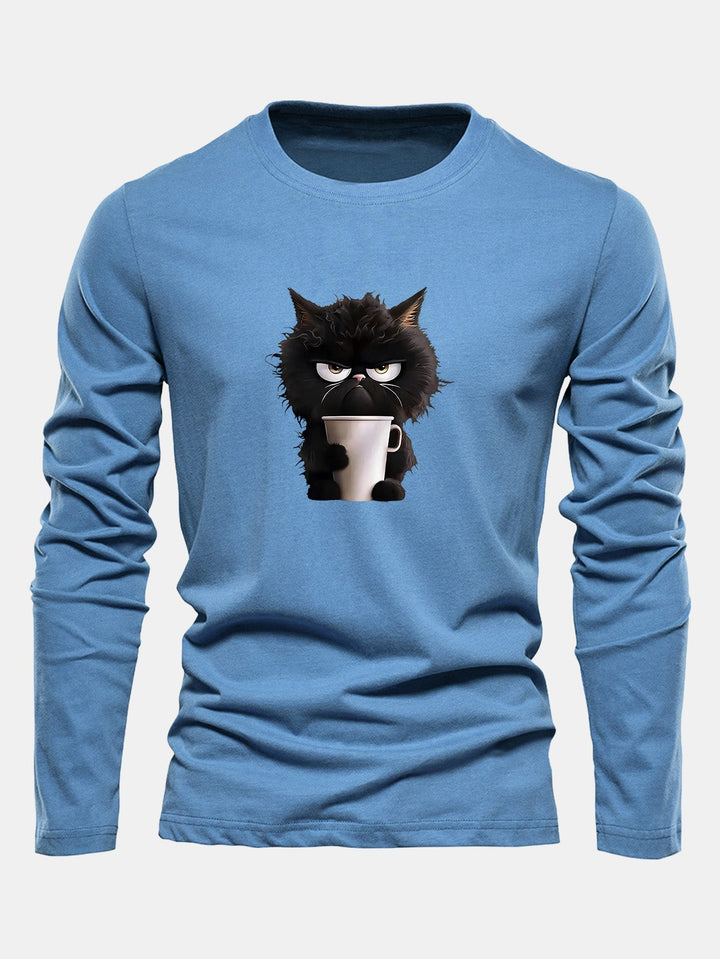 T-shirt à manches longues en coton avec motif de chat noir dégustant un café