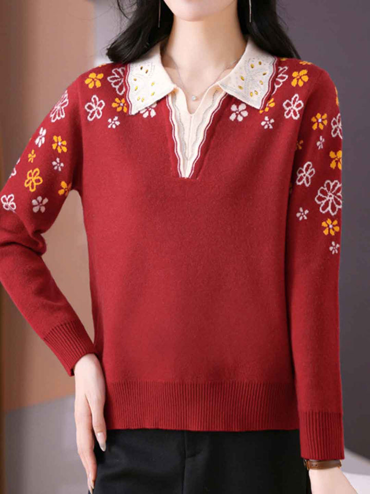 Top Tricoté Brodé Décontracté à Col Revers Jocelyn